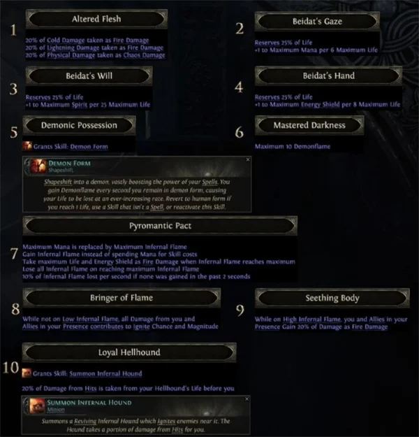 变异之肉-贝达特的凝视-贝达特的意志-贝达特之手-恶魔附身-精通黑暗-火焰魔法契约-火焰使者-沸腾之躯-忠诚地狱犬-燃烧的狞笑