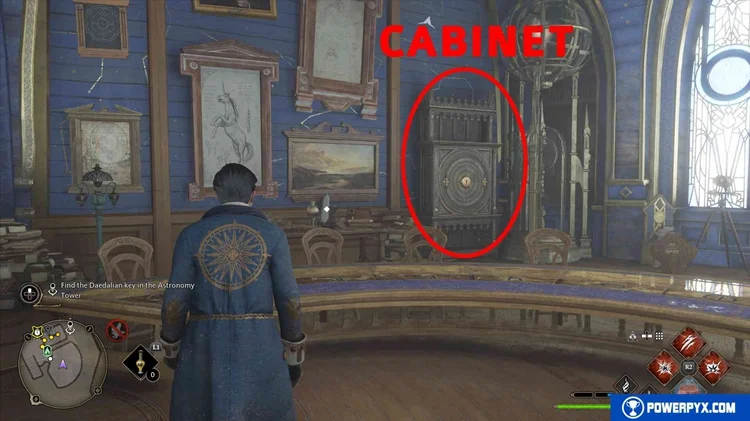 第一个钥匙会自动在地图上由任务图标标记。它在天文教室里,但首先你需要抓住钥匙。从天文塔快速上楼,钥匙将自动开始飞下楼到天文教室。使用 Revelio 将其标记为蓝色并与机柜交互。然后与柜子上的飞行钥匙互动,并将其拍入锁中。