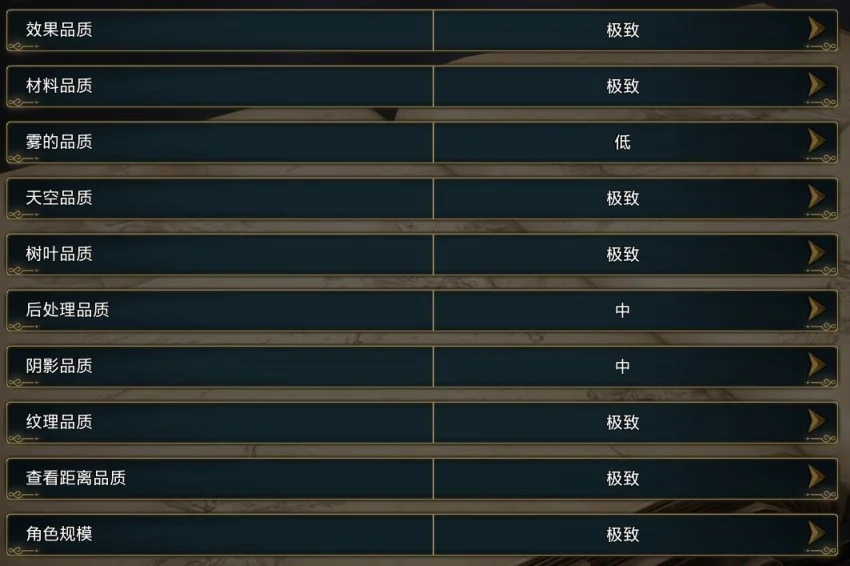 雾品质、阴影品质和后期处理蛮吃性能的,建议雾调低,阴影调成中或者低,后期处理调中。