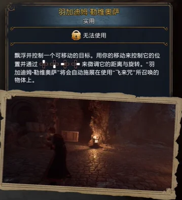 羽加迪姆·勒维奥萨:飘浮并控制一个可移动的目标。用你的移动来控制它的位置并通过操作来微调它的距离与旋转。“羽加迪姆·勒维奥萨”将会自动施展在使用“飞来咒”所召唤的物体上。
