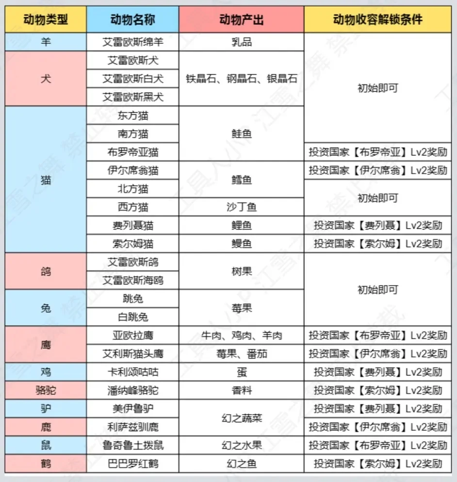 牧场最多能放置5只小动物,在每次通关一个章节后返回【索拉涅尔】牧场时可收获产物道具。可收容动物的品种可通过【国家投资】奖励来解锁,详细信息如下图所示。