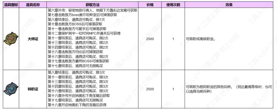 基础兵种转基础兵种、高级兵种转基础兵种或高级兵种时,需要道具转职证,高级职业使用转职证横转时可“自由”转职成拥有武器资质的兵种类型。