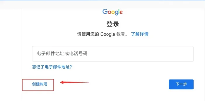 之后会看到,要求我们登录谷歌账号的操作,有能正常登录的谷歌账号直接登录即可,如果没有可以按照下图的创建账号指示点击进去