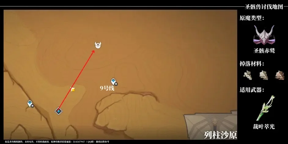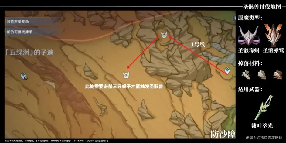 从图示传送点出发往西北方向飞去可看见一个大鸟巢。击杀原魔后往西南方向到达图示所在位置,击杀三只蝎子后可触发圣骸兽
