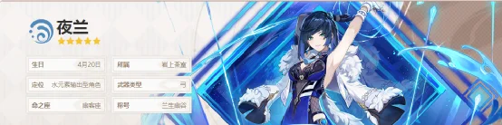 夜兰的定位是水属性后台持续输出,凭借着高水元素附着判定的特性可以和许多能与水元素产生元素反应的驻场主C角色打出不错的配合。部分充能循环效果达标且后台输出能力优秀的夜兰,甚至能打出不低于前台驻场输出角色的伤害。元素战技的高机动位移特性更是能在部分作战场合中快速移动接近敌人/拉开身位,熟练运用更是能靠着机动性做到控场压制效果。