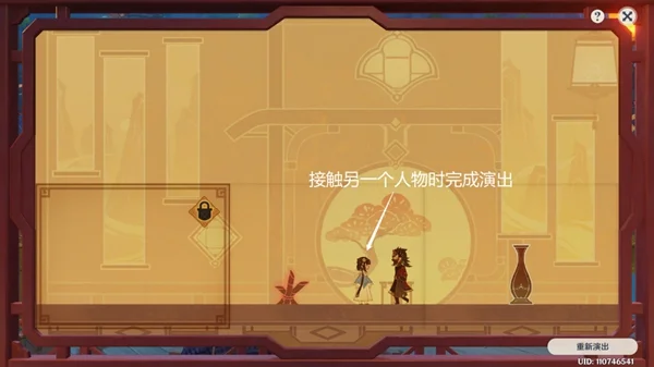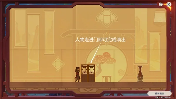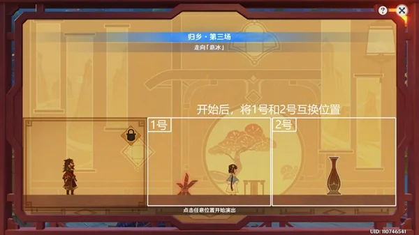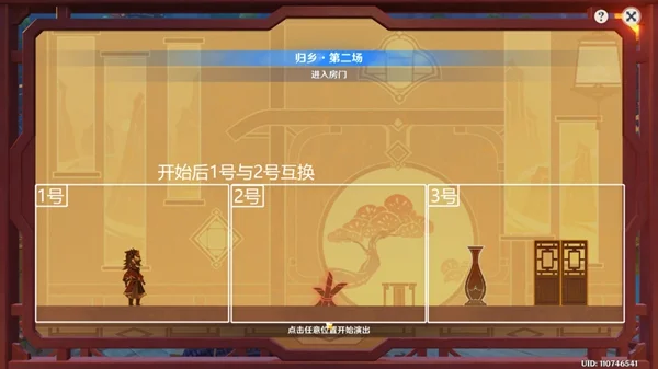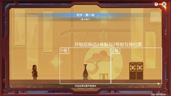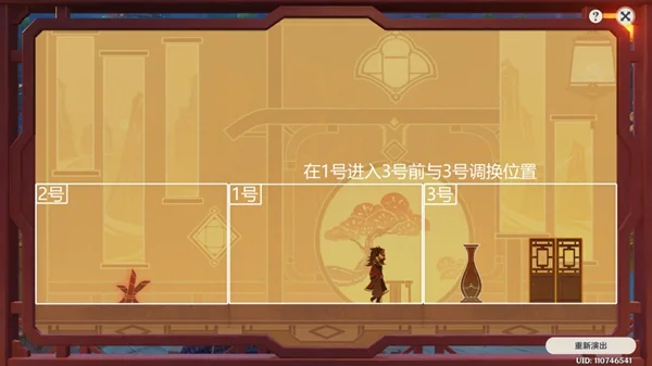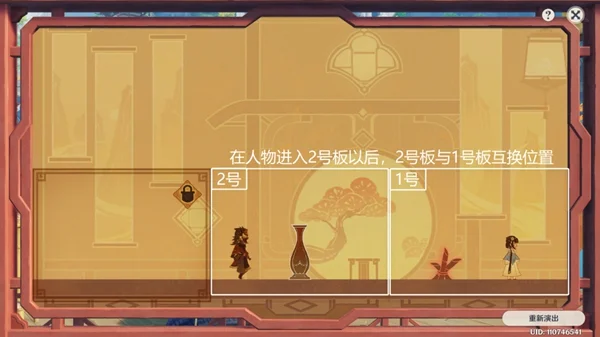 演出开始后,拖动1号板,与2号板互换位置。(动作应在人物走进1号板前)