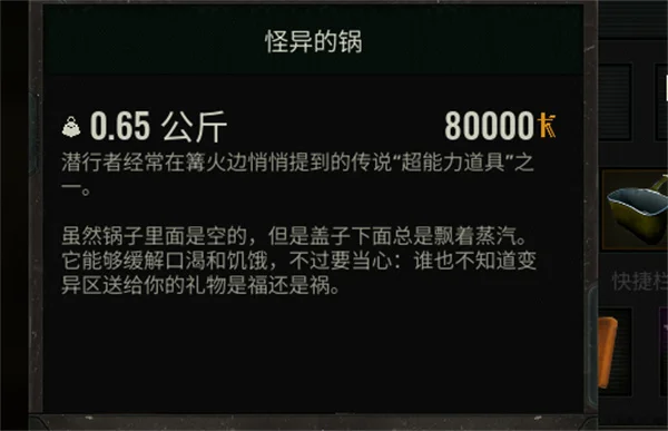 虽然锅子里面是空的,但是盖子下面总是飘着蒸汽。它能够缓解口渴和饥饿,不过要当心,谁也不知道变异区送给你的礼物是福还是祸。
