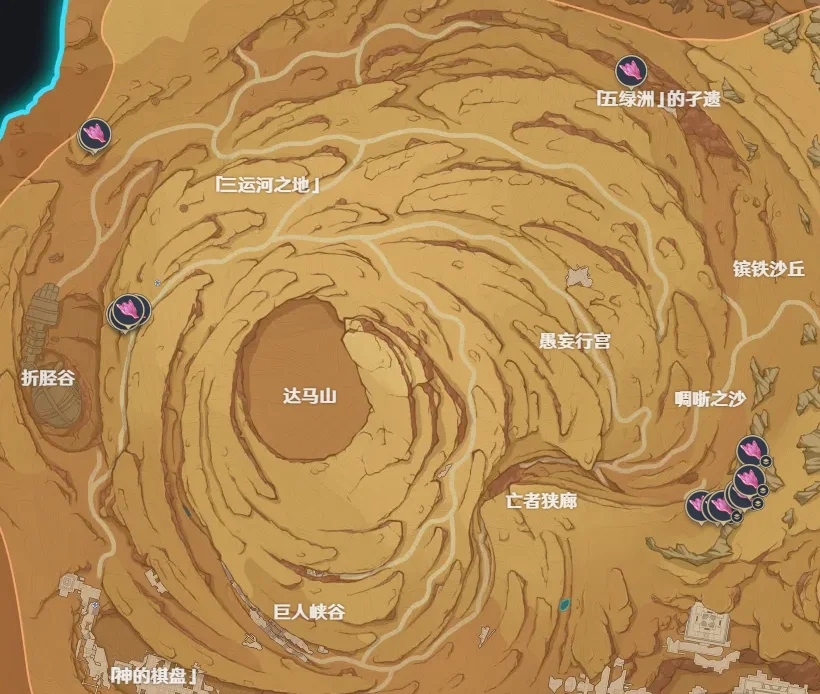 原神神秘的肉在千壑沙地地区可以获得,地图分布可以参考上图,想要快速获取神秘的肉的玩家赶快前往上图位置吧。