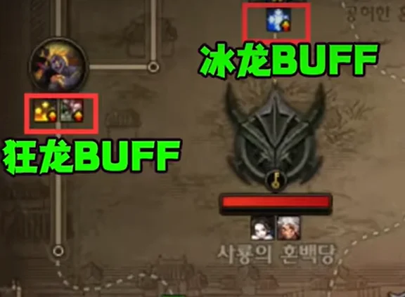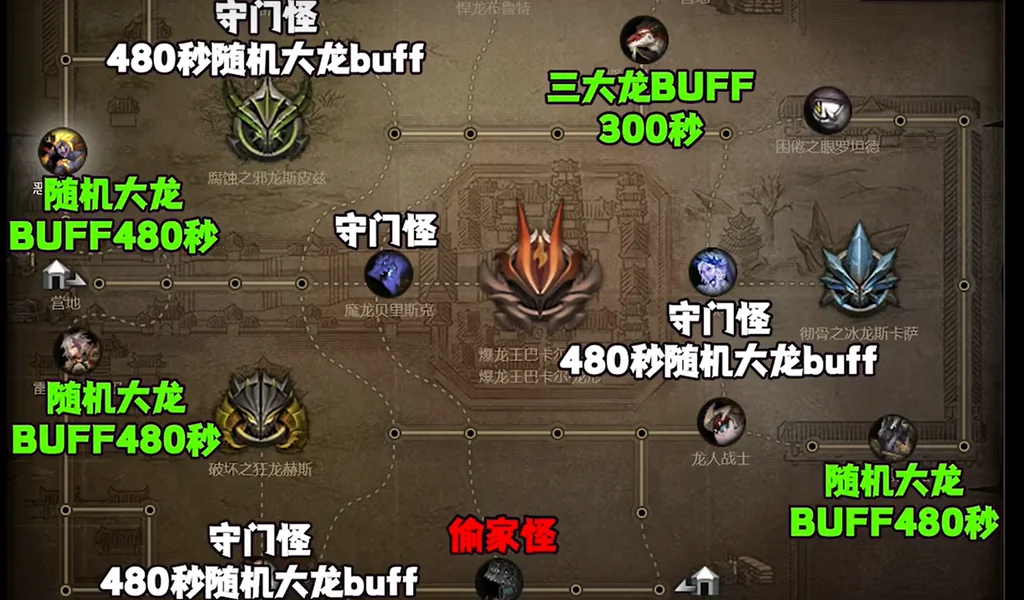 红队找随机BUFF怪,三龙区域刷新双龙BUFF,对应区域的BUFF怪不会刷新本区域的BUFF,比如冰龙处没有冰冻BUFF,邪龙处没有中毒buff