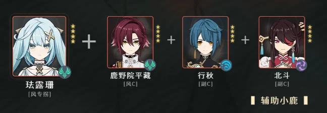 说明:小鹿武装,珐露珊可以带风套4减水雷抗性,行秋和北斗叠加减伤效果,没奶也能应付大多数场景。
