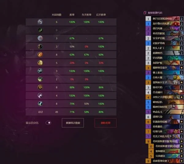 图上基本可以看到,dk、萨满、轮盘术都是大优对局,法师、猎人和战士内战属于小优,土灵骑劣势较大,亲王贼基本没法打。可以说在目前环境下优势对局还是很多的,绝对可以上分的一套牌。
