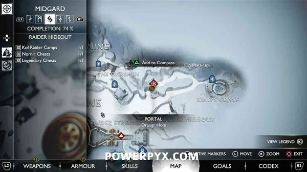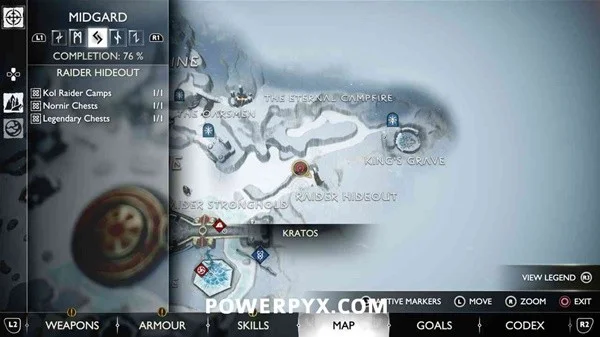 在乌鸦下方,突袭者藏身处入口右侧。要生成宝藏,您必须首先收集藏宝图,它来自在米德加德>突袭者堡发现的传说卷轴收藏品。参见攻略堡收藏品:#2 传说(藏宝图 - 维京人的礼物)。在攻略堡垒中完成 100% 时,您将自动获得它。之后回溯到这里,宝藏就会在地面上发出金色的光芒。