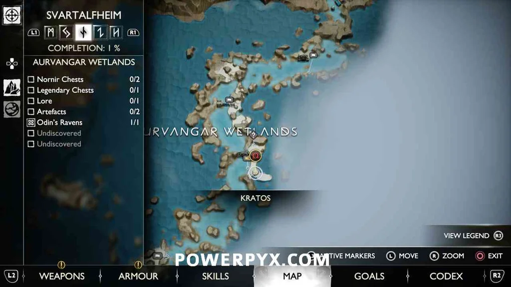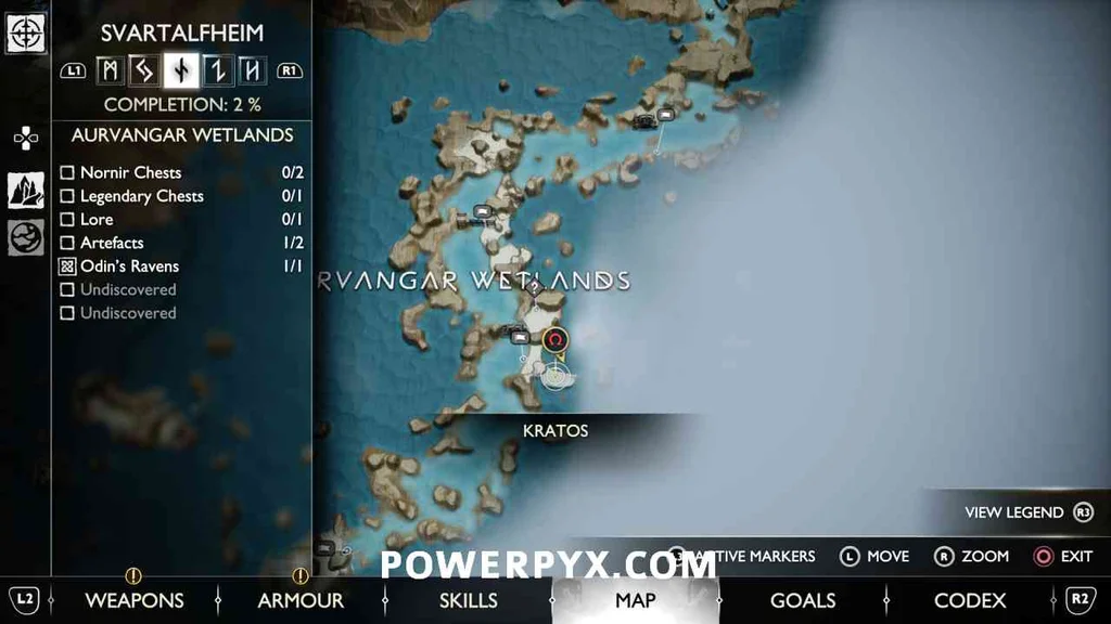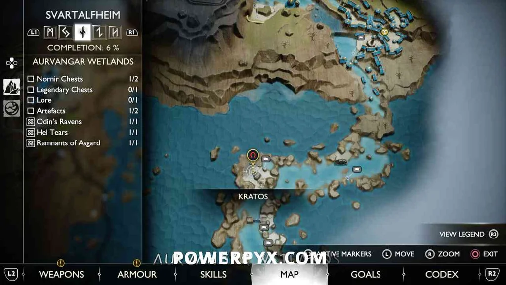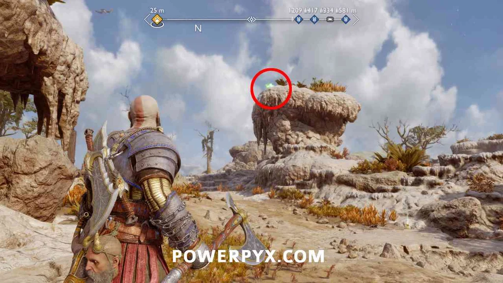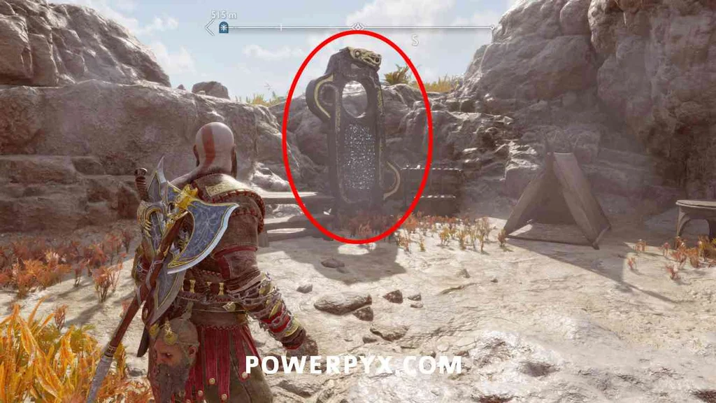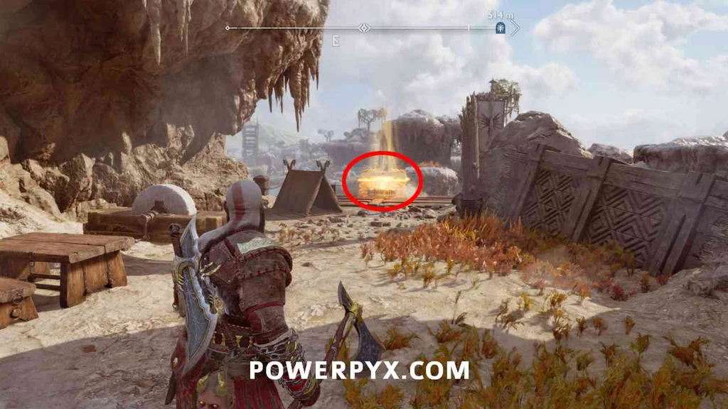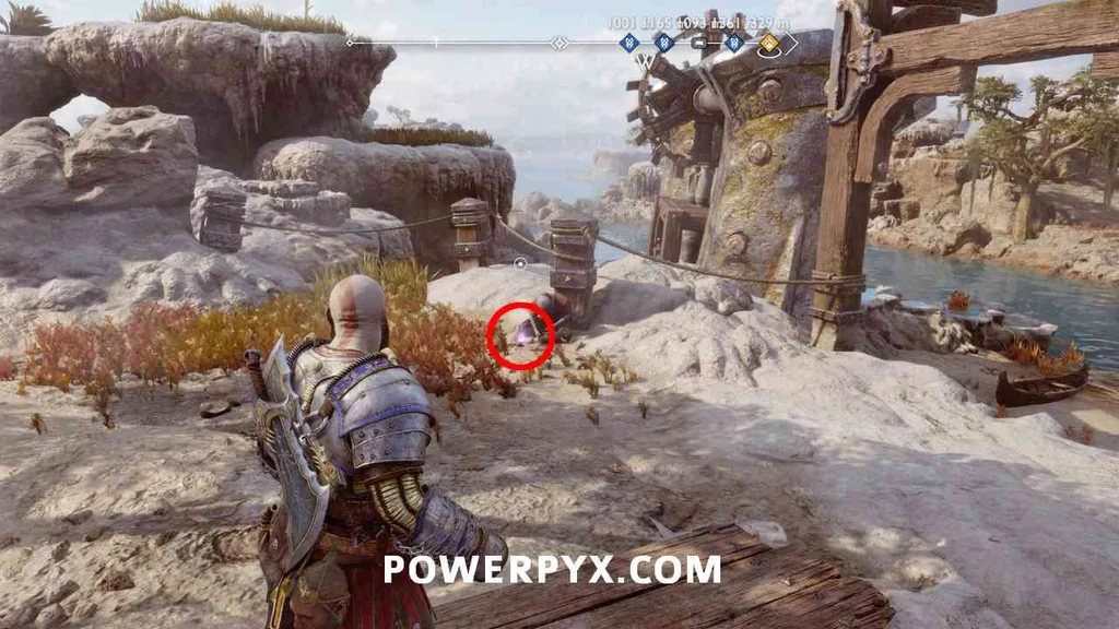 相同的区域,诺尼尔宝箱是在从神器所在的岩石上掉下来之后。但首先你必须摧毁 3 个封印,它们看起来像岩石,上面有蓝色发光的字形,扔给你斧头摧毁它们。第一个是在神器所在的山上。第二个是在一个小岛上的诺尼尔箱子后面。第三个是在胸部右侧的一块小石头上。下图的所有 3 个字形都用红色圈出。摧毁所有 3 个后,您可以打开宝箱。
