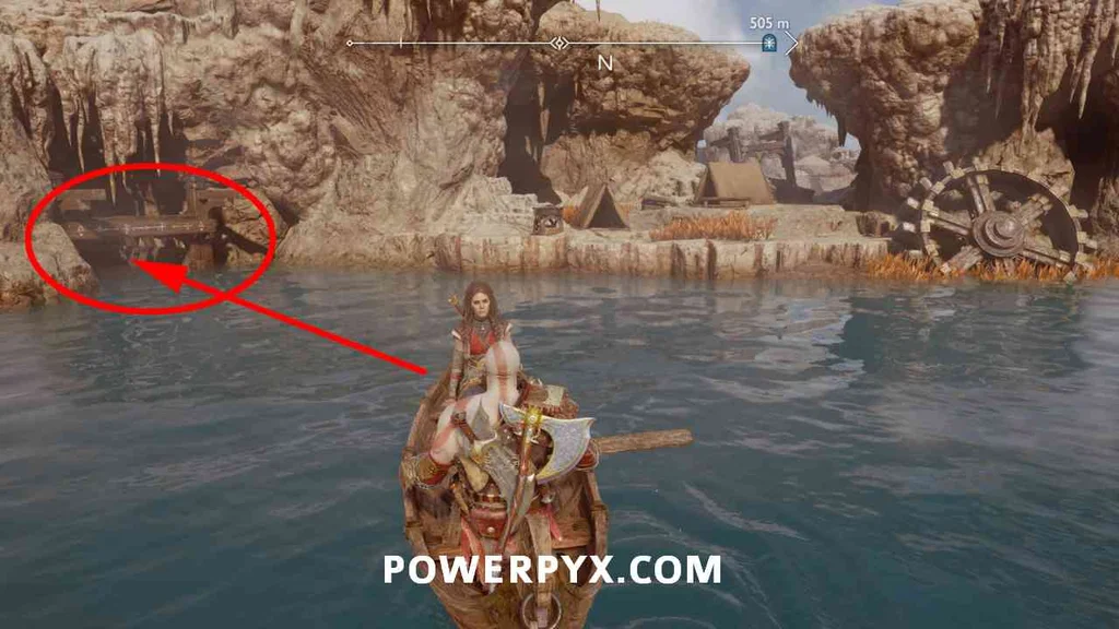 划船直到你到达水车。在水车的右侧,将斧头扔向间歇泉以冻结它。跳过它并向右转找到另一个间歇泉。把这个也冷冻起来,然后爬上它后面的墙,到达岩石的顶部。在那里从一具尸体上捡起了紫色发光的神器。