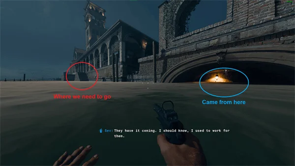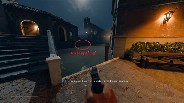 在任务开始时,把河边的守卫带出来,然后朝左手边的一个河口走去。游过隧道,出口后右转,朝楼梯走去。