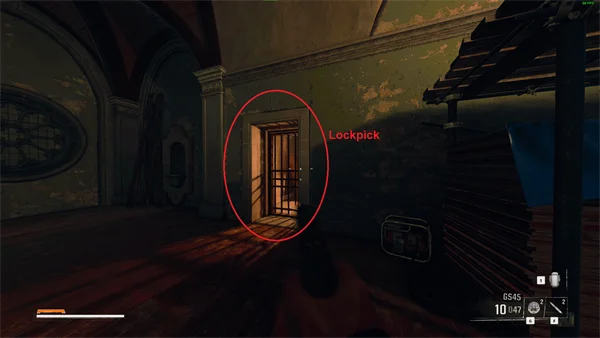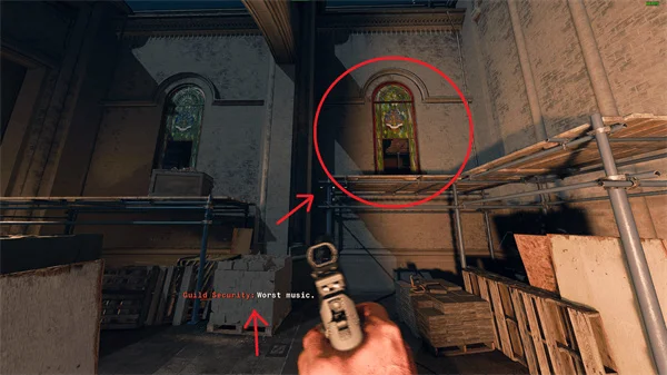 走上楼梯后,左转,沿着脚手架走。干掉附近的敌人,然后爬到你右边打开的窗户前。进入后右转,发现一扇锁着的酒吧门,这就是钟楼入口。爬上梯子。