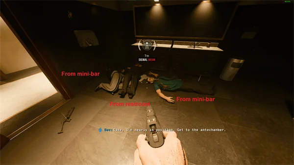 通过发出声音或让他们看到你到足以怀疑的程度,引诱剩下的两名警卫进入洗手间,然后躲回洗手间。当他们靠近时杀了他们。然后蹲下,安静地走上楼梯。在楼梯顶部,等待左边的警卫背对,右边的警卫走开,然后杀死左边的警卫,走到左边的门前。糟糕的成就:)