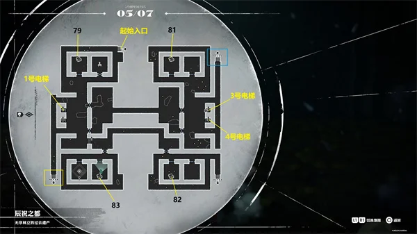 起始入口西侧,休息室西侧的宝箱79,里面是纯白铠甲;向地图西南方走,黄框处楼梯下去,来到地图06/07西南方隔间,隔间北部的宝箱80,这个宝箱是宝箱怪,击杀获得雷神之枪;楼梯回到地图05/07,一路向东走,东北方房间的宝箱81,里面是月女神之拳;坐4号电梯下去,地图06/07重走一遍之前黄线(上面图)上楼梯,回到地图05/07,东南方房间的宝箱82,里面是孤注一掷算盘;按照红线,现在去地图05/07西南方,西南方房间的宝箱83,里面是溺爱项圈,同时去隔壁房间把3号电梯的开关打开。这样地图05/074个宝箱就拿了。
