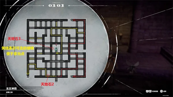 如图,先走左边的黄线去拿宝箱,顺路拿天地石2,宝箱76,里面是安神帽子,拿完宝箱按照黄线原路返回入口。左侧黄颜色横线或竖线的楼梯表示可以走的,但是为了拿宝箱不走左侧。