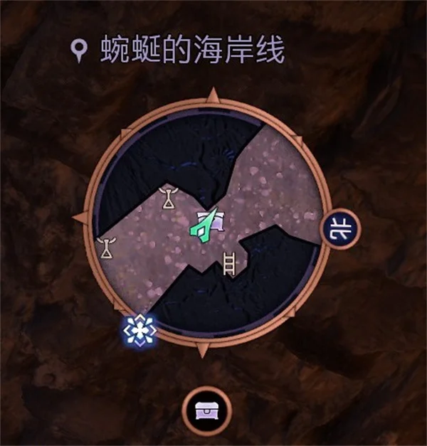 宝箱也基本在任务中很显眼的位置。似乎所有内有装备的箱子在附近时,小地图下方都会有如图所示的标志:
