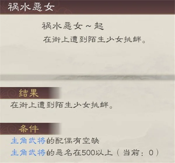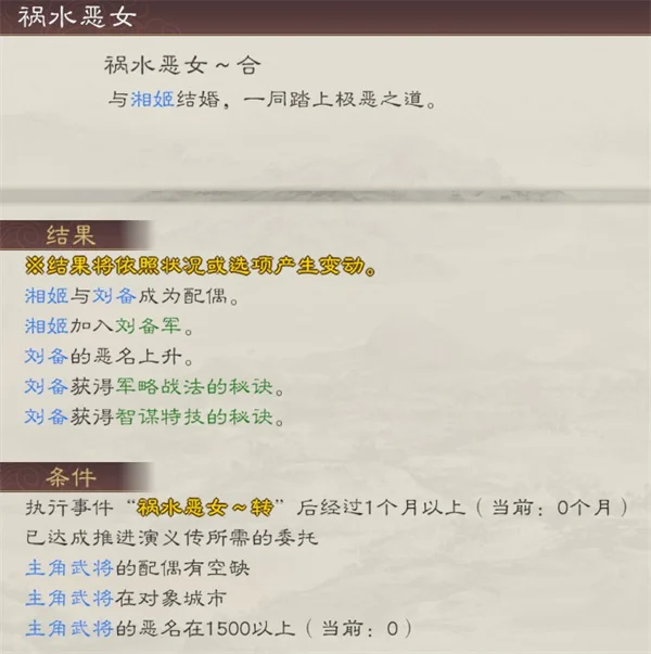 另外就是这位跟昭华姬完全冲突。昭华姬全程要求0恶名,要想同时坐拥这两位,等于说你要么先1500恶名娶了湘姬,再慢慢把恶名刷下去去做昭华姬的任务,或者0恶名20个城拿下昭华姬后再去翻脸当个带恶人,总之都挺emmmm的。