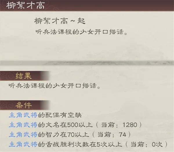 娶妻条件基本上是上面武妹子的智力版,同样最后任务有一个智力60-70-80的三连战,建议85智力再来或者强行背板。另外要注意需要5次舌战胜利才会开任务。