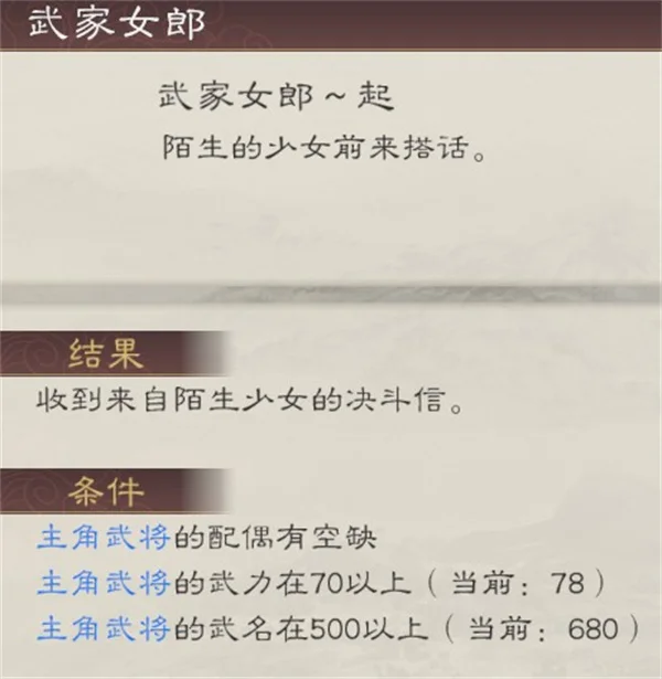 虽然70武力就能开任务线,但最终任务有61-73-86武力的三连战,最好是能有个80-85及以上再去挑战。不过由于这代单挑跟舌战都能用SL来背板,武力70也不是不能过。并且同时还需要1500武名。