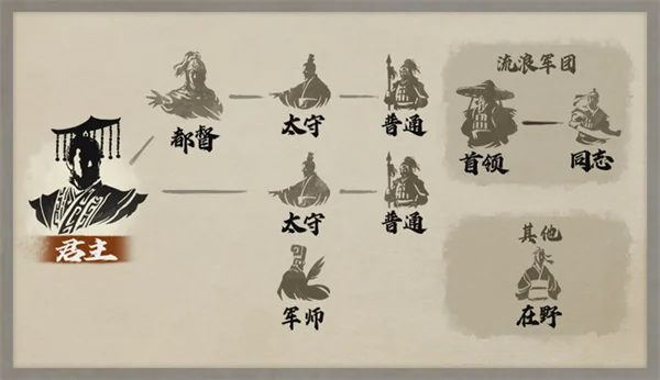 武将有不同的“身份”,诸如君主或军师等。不同身份可执行的指令也有所不同。