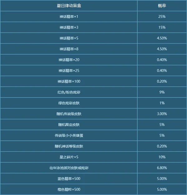 通过解锁【盛夏和弦宝典】并达到75级可获得【随机神话皮肤宝箱】,内含任意一款发售一年以上的优先奖池内未拥有至臻/海克斯皮肤。若已拥有奖池内所有皮肤,则将获得125神话精萃 (本奖池内至臻皮肤均不附赠图标,与神话精萃商店兑换保持一致,敬请召唤师注意)。