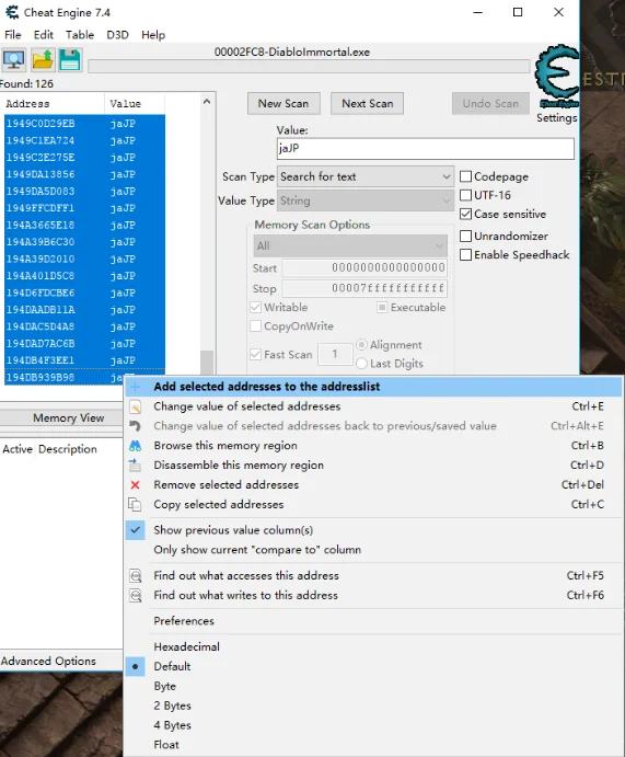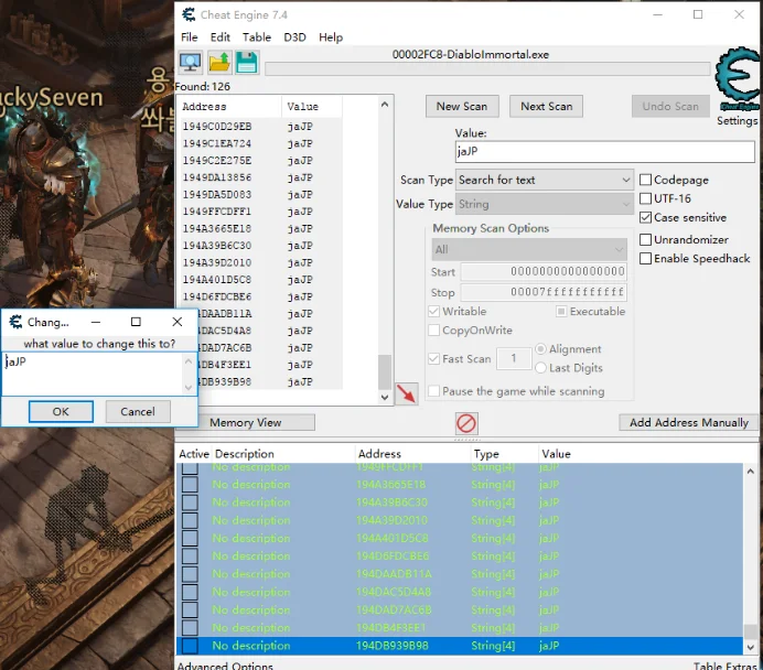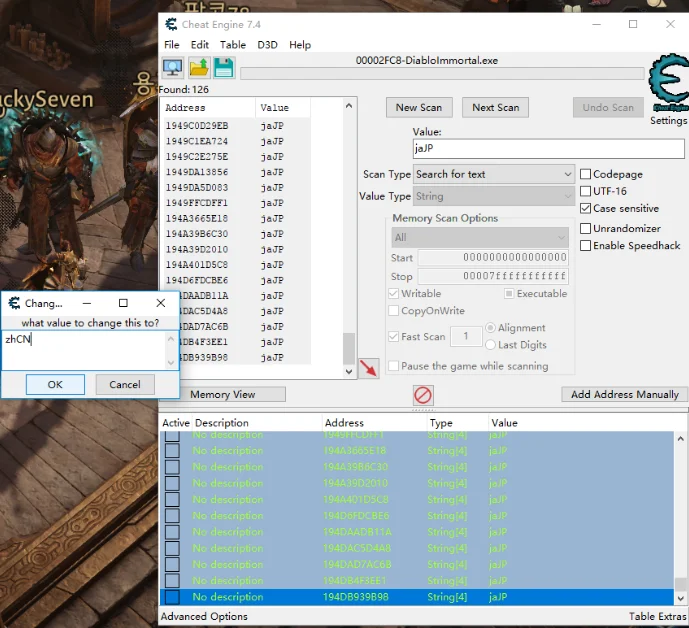重点随便选个语言进游戏,不要选日的。然后用CE打开暗黑按图操作。游戏关了要重新搞,小退什么的没事。