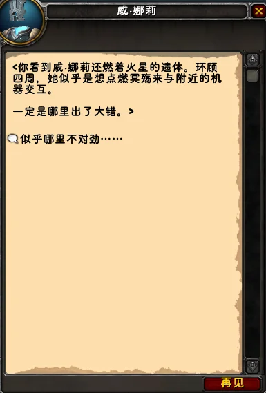在噬渊与威·娜莉的镜像互动后将完成隐藏任务65740,允许玩家与造物化生台前的威·娜莉“尸体”互动,互动的同时可完成隐藏任务65488。