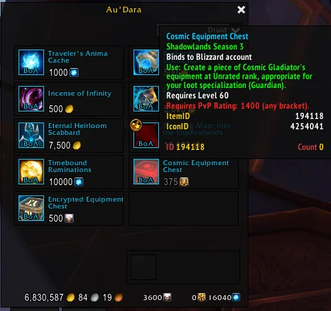 宇宙装备箱:售价375征服点,包含一件PVP第三赛季装备