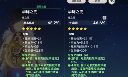 如果你带的是生命沙,那带双暴头肯定是最合适的。但如果你带的是充能沙,就要看夜兰生命值是否高于3万2了,如果是3万1左右,则需要看你生命头和爆伤头,哪个副词条比较好。