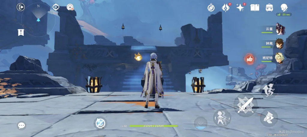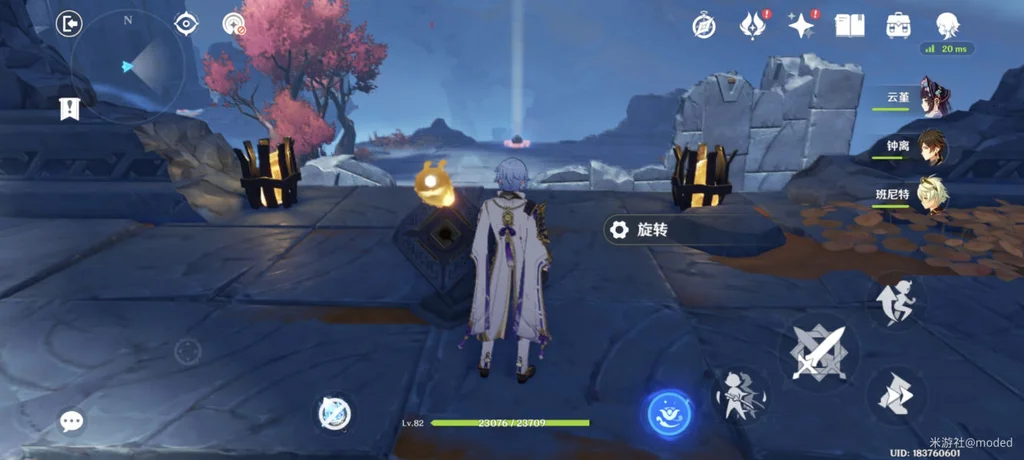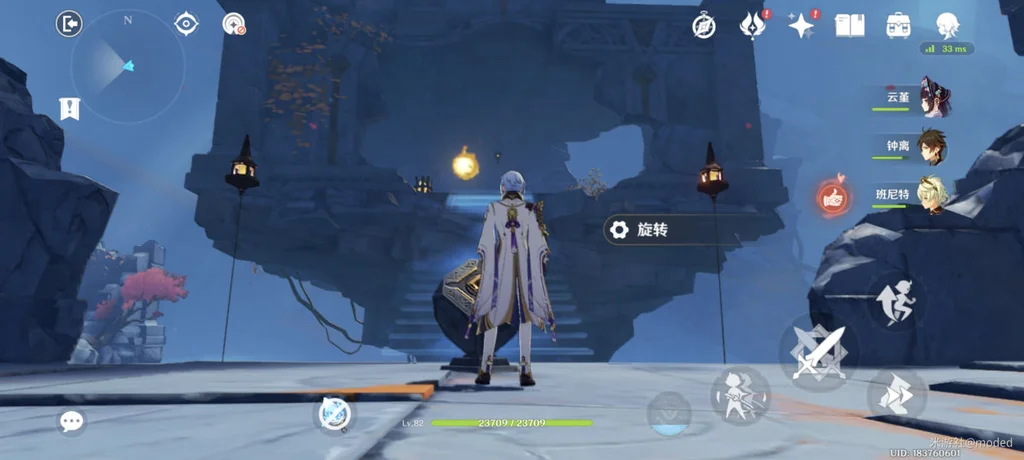 1.进入秘境后,把视角转到右边,可以看到一个机关转一下,如下图会出现浮现的桥往前走