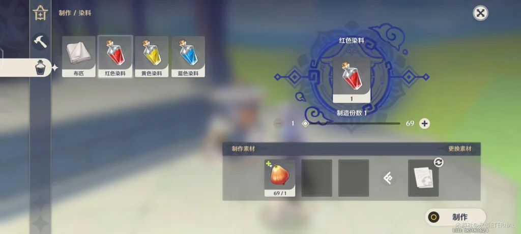 玩家在阿圆处点击制作摆设,选择染剂分项,然后选择红色染料即可制作。