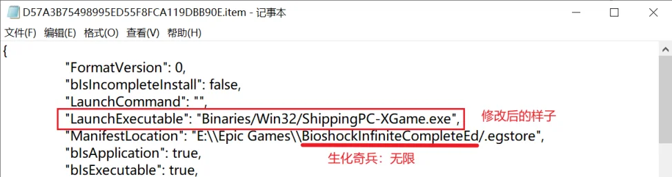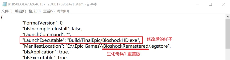 如果是《生化奇兵1 重置版》,LaunchExecutable那行要修改为"LaunchExecutable": "Build/FinalEpic/BioshockHD.exe",并保存文件。