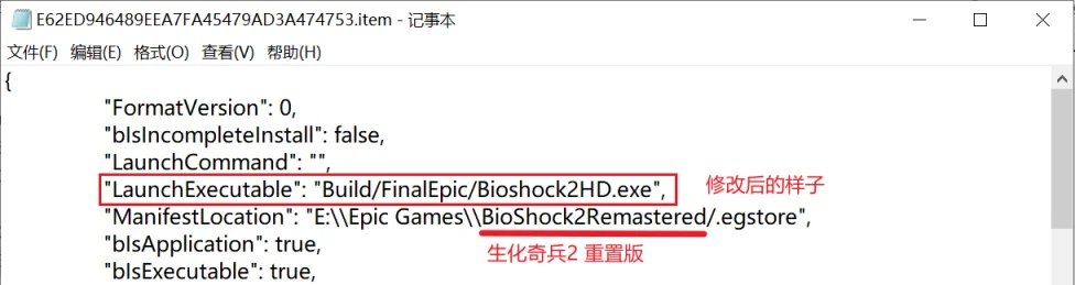 如果是《生化奇兵2 重置版》,LaunchExecutable那行要修改为"LaunchExecutable": "Build/FinalEpic/Bioshock2HD.exe",并保存文件。