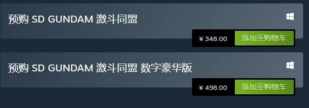 sd高达激斗同盟分为标准版和豪华版两个版本,标准版价格为348元,豪华版价格为498元。