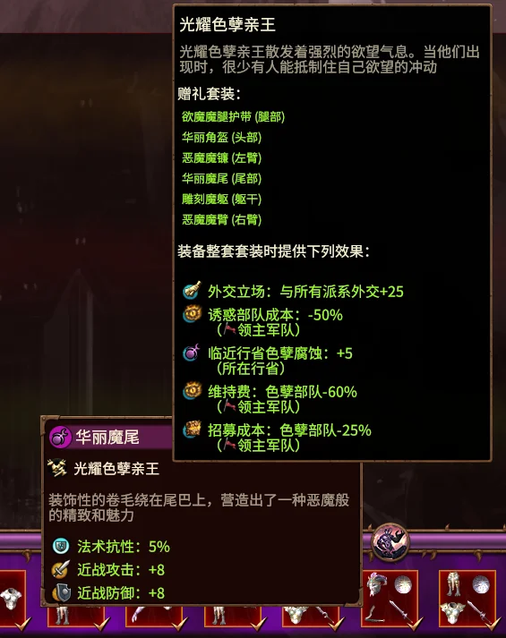 色孽系恶魔亲王的高级套装之一,全派系外交+25!这样色孽恶魔亲王总共最高能获得25+15+25=65全派系外交加成,比本家纳卡里还高