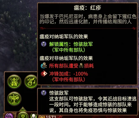 所有部队的瘟疫必定选红疹,没有之一,其惊骇效果是本队全军有效,对伏击战来说这点很有用,而如果敌军倒霉染上病不仅吃损耗还会冲锋加成归零,打基斯里夫时能有效降低战损
