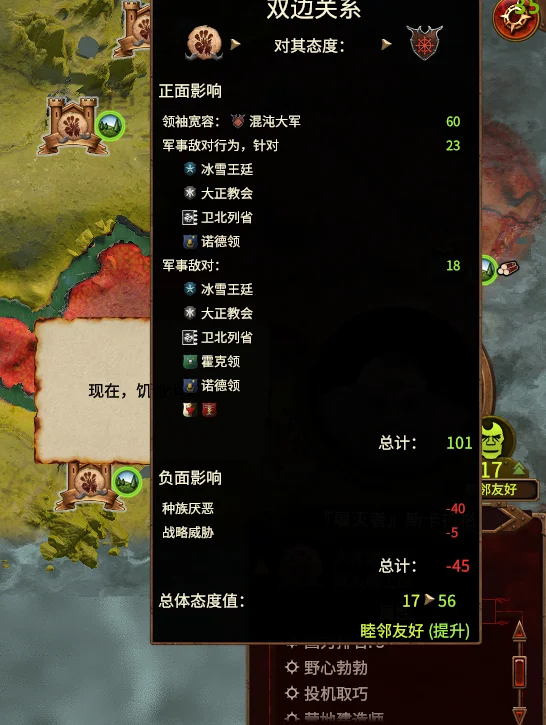 于是面对斯卡拉格时,色孽恶魔亲王可通过以上外交加成与攻打其他秩序阵营,与斯卡拉格长期保持绿脸,甚至同盟也是轻而易举,至于你想打他还是跟他同盟,主动权完全掌握在自己手中