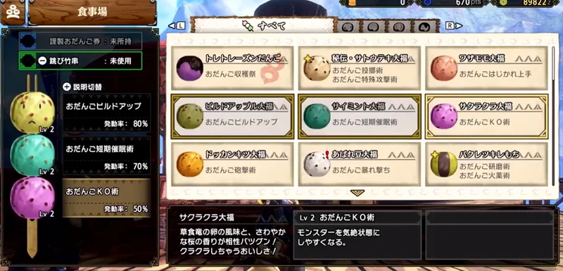《怪物猎人崛起:曙光》新系统介绍 - 【跃动竹签】在茶点店用餐时,除普通的竹签外,还可以选择新的“跃动竹签”。选择“跃动竹签”后,会根据串团子的顺序产生等级差异,令技能等级与发动概率变化。