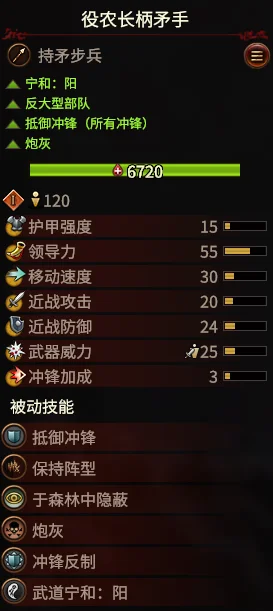 反大,抵御所有冲锋,属性在同本同价位里算上宁和加成还可以,关键是人多便宜量大,抗近战和反大都不错,虽然质量轻,但是人多+冲锋反制,比玉勇剑盾抗冲阵要强的多,20点反大加成对面大型单位过来基本都是有去无回,缺点是士气低,不太能抗远程火力,纵观锤2到锤3老农矛在0-1本兵里论性价比能提名最高,算是震旦牌面兵种了 评分:★★★★★