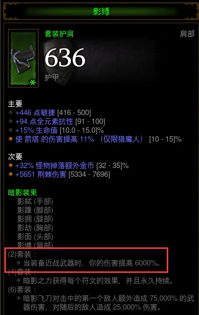 1. 暗影二件套:装备近战武器时,伤害提高6000%。(隔壁阿克汉六件2000%和不朽之王六件4000%已经馋哭了。)暗影套的缺点在于增伤不足减伤没有,且只能装备近战武器,很多技能和装备不能用;而好处则是只占用两个位置,装备选择空间大。
