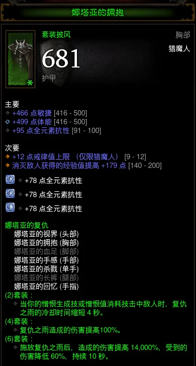 3. 娜塔亚六件套:释放复仇之雨后伤害提高14000%,减伤60%,持续10秒。娜套优点在于全局增伤和减伤都是猎魔人最高,缺点在于需要占用6个装备/萃取,装备选择空间小。