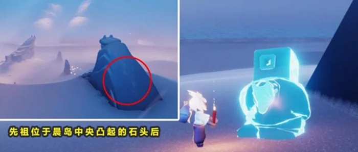 2、玩家在晨岛的沙漠平原上往右侧飞可以看到一个大石头,在石头下方就可以找到这个先祖。