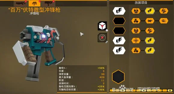 听名字就知道这是一把和“电”相关的枪,把第一、四、五行和触电相关的加点都点上,分别是增加触电几率、增加对触电目标的伤害、增加触电目标向附近单位传染触电状态的几率。触电首先是个强力减速状态,其次触电单位会持续掉血。第二、三行的加点看个人喜好。这种加点之下,这把枪有控有爆发,对付三五成群的小股虫群,一梭子扫下去,不死的虫子也都挂着触电,方便自身走位,切禁卫和暴君之流效果也不错。但如果是四面八方茫茫多的虫潮,这把枪就略显乏力。建议搭配切割机和电浆雷,切割机和电浆雷用来清大虫潮,然后用微冲清残血单位打扫战场。