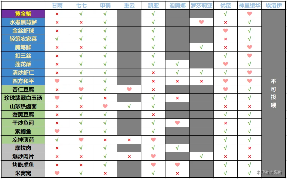 (♥-喜欢,符合喜好;√-一般,可以接受;×-不喜欢,讨厌)