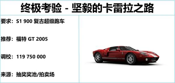 因为终极考验的第三张图是环岛路线,比赛耗时堪称坐牢。为了稳妥起见,推荐了这款多次参与活动的福特 GT 2005,S1 级别的PVP高强度车辆,擅长冲刺。
