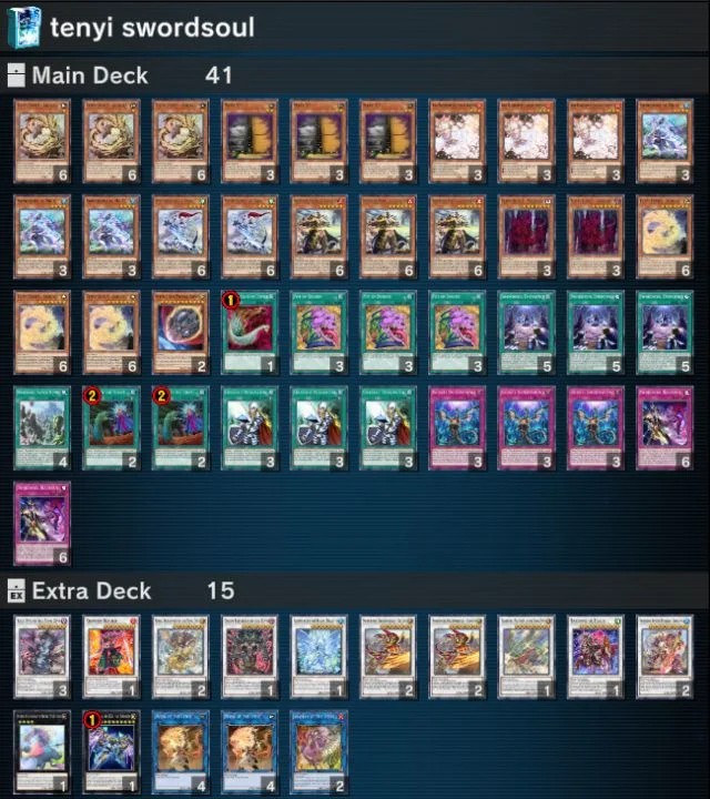 主卡我认为没有需要过多赘述的地方,这里简单讨论一下额外的选择,首先天威相剑常用额外是8星和10星的同调怪兽,其中辉龙星,2赤霄,魔救龙,承影,鲜花都是不可撼动的卡位,对于天威轴来说两拳僧一仙女也可以算作必需品。(2拳僧可以做到后手光龙ss,变拳僧,墓地效果拉暗龙,变拳僧,然后弹1)
